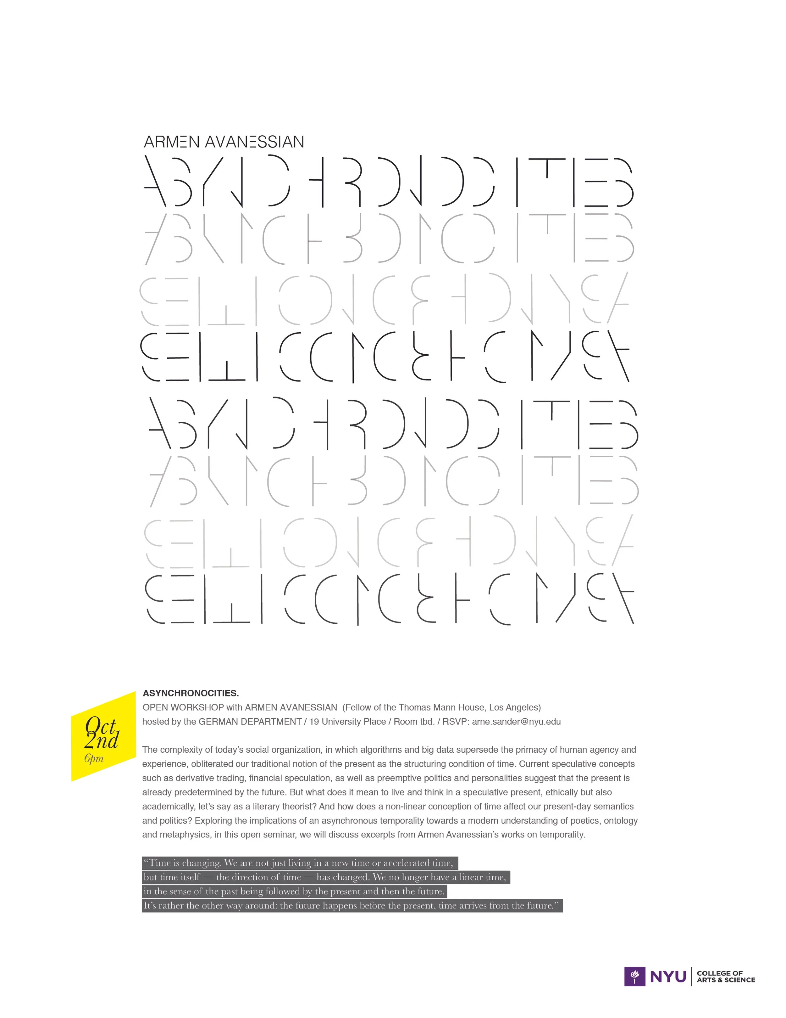 The complexity of today’s social organization, in which algorithms and big data supersede the primacy of human agency and experience, obliterated our traditional notion of the present as the structuring condition of time. Current speculative concepts such as derivative trading, financial speculation, as well as preemptive politics and personalities suggest that the present is already predetermined by the future. But what does it mean to live and think in a speculative present, ethically but also academically, let’s say as a literary theorist? And how does a non-linear conception of time affect our present-day semantics and politics? Exploring the implications of an asynchronous temporality towards a modern understanding of poetics, ontology and metaphysics, in this open seminar, we will discuss excerpts from Armen Avanessian’s works on temporality.
